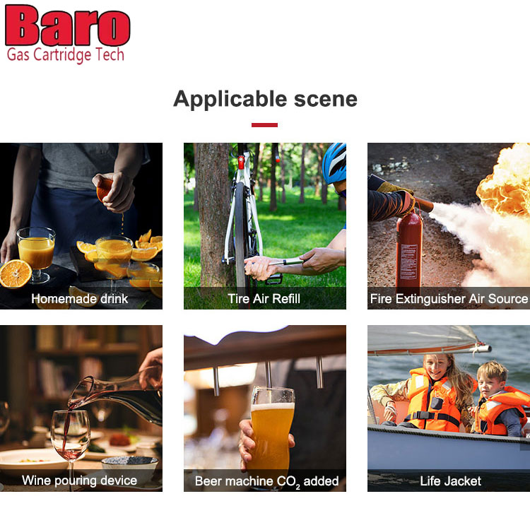 ပရီမီယံအရည်အသွေး 33g CO2 Thread Cartridges Cylinders များသည် အသက်ကယ်အင်္ကျီများ၊ ခါးပတ်ထုပ်များ၊ သို့မဟုတ် Personal flotation device (PFD) အပါအဝင် အသက်ကယ်အင်္ကျီများ (အသက်ကယ်အင်္ကျီများ၊ ခါးပတ်ကြိုးများအပါအဝင်) လက်စွဲဗားရှင်းအတွက်သာဖြစ်ပြီး ၎င်းသည် 1/2 လက်မချည် CO2 ကျည်တောင့်များကို ယူဆောင်သည့် အသက်ကယ်အင်္ကျီများနှင့် တွဲဖက်အသုံးပြုနိုင်ပါသည်။ ကျေးဇူးပြု၍ ပြုလုပ်ပါ။ သင့်အသက်ကယ်အင်္ကျီ၏အတက်အကျအဆင့်သတ်မှတ်ချက်နှင့်ကိုက်ညီသော CO2 ဆလင်ဒါအရွယ်အစားကို သေချာရွေးချယ်ပါ။